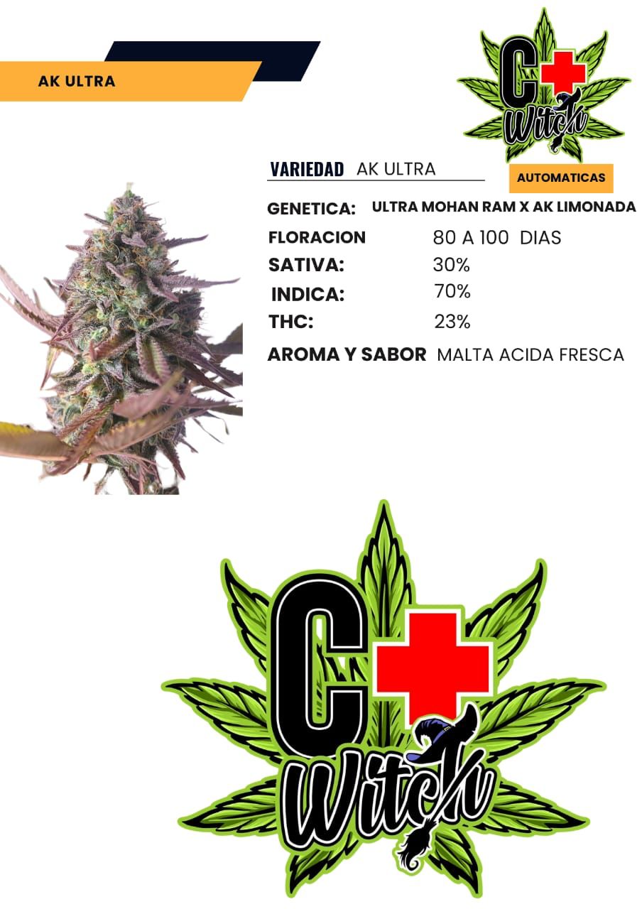🌱 Variedad: AK Ultra Auto (Automática) 🧬 Genética: Ultra Mohan Ram x AK Alimonada ⚖️ Dominancia: 70% Índica / 30% Sativa 💥 THC: 23% 🗓️ Ciclo Completo: 80 a 100 Días 👃👅 Aroma y Sabor: Malta Ácida Fresca Nace de la unión entre la relajante Ultra Mohan Ram y la vibrante AK Alimonada, combinando lo…