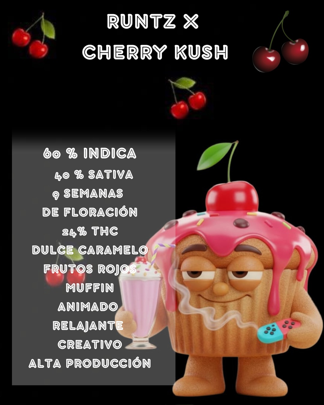🍒 RUNTZ X CHERRY KUSH 🌱 60 % INDICA – 40 % SATIVA ⏳ 9 SEMANAS DE FLORACIÓN 🔥 24% THC 🍬 DULCE CARAMELO 🍓 FRUTOS ROJOS 🧁 MUFFIN 😎 ANIMADO 😌 RELAJANTE 💡 CREATIVO 📈 ALTA PRODUCCIÓN