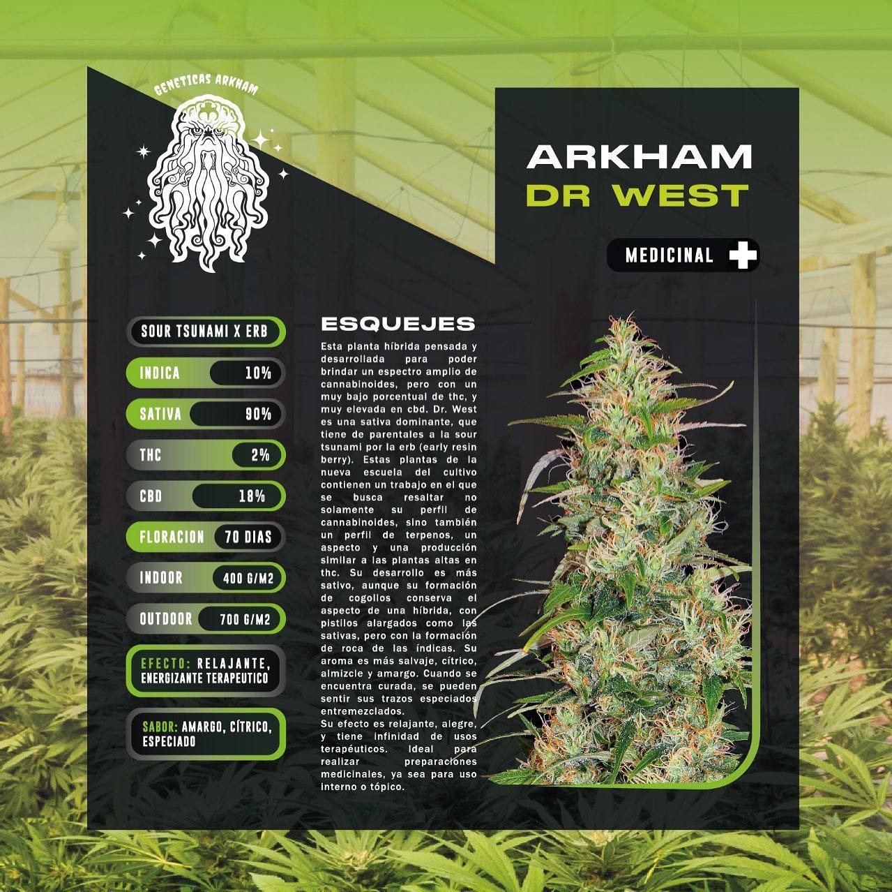 Dr. West es una sativa dominante. Estas plantas de la nueva escuela del cultivo contienen un trabajo en el que se busca resaltar no solamente su perfil de cannabinoides, sino también un perfil de terpenos, un aspecto y una producción similar a las plantas altas en THC.