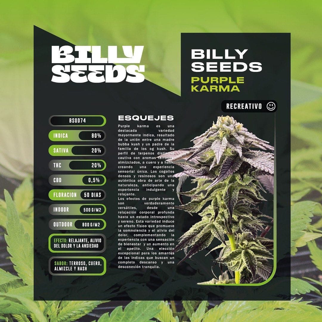 Purple Karma nace del cruce entre la Bubba Kush, originaria de California con raíces en la escena underground, y la legendaria OG Kush, una joya de las colinas de Hollywood famosa desde los 90 por su influencia cannábica global. Esta índica dominante florece a mediados de enero y se cosecha en marzo (Hemisferio Sur).