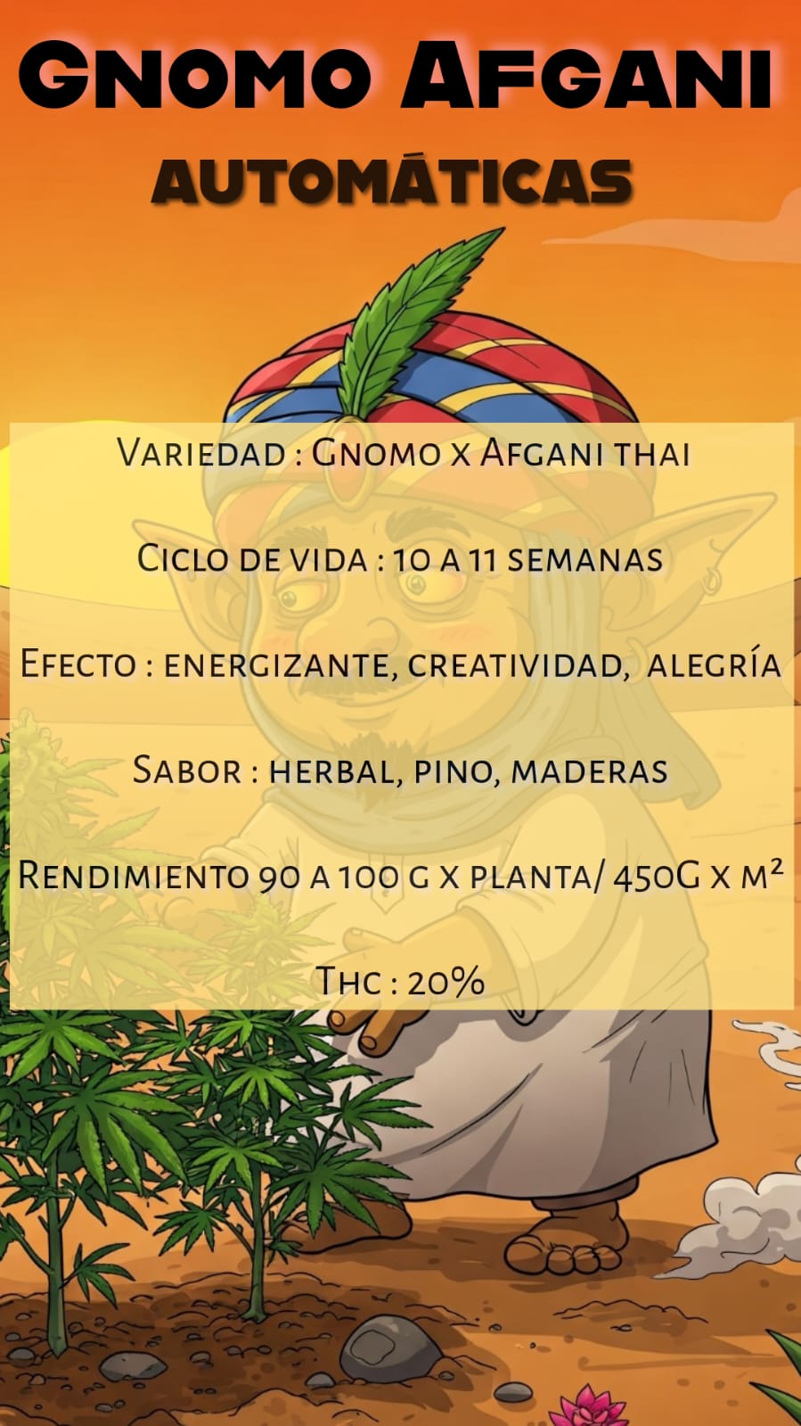 Prepárate para una experiencia de cultivo inigualable con nuestra variedad estrella: la Gnomo Afgani Automática. Esta joya cannábica es el resultado de un cruce excepcional entre la misteriosa Gnomo y la potente Afgani Thai, combinando lo mejor de dos mundos en una sola planta.
