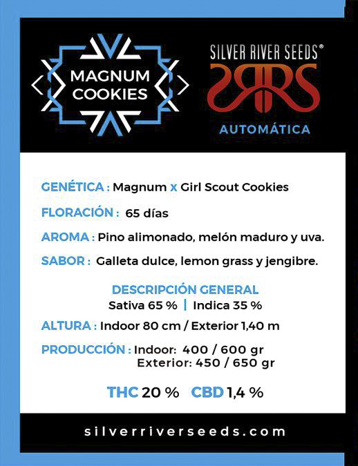 Variedad: MAGNUM COOKIES Genética: Mágnum x Girl Scout Cookies Floración: 85 días desde germinación Sativa: 65% – Indica: 35% Altura: Indoor: 80cm | Exterior: 1,4m Producción: Indoor: 400 / 600gr x m2 Exterior: 450 / 650 gr x m2 THC: 20% CBD: 1,4% Esta genética fue creada para la producción extrema, su parental principal la Mágnum es reconocida históricamente por su gran producción dentro de las autoflorecientes Una combinación exquisita de…