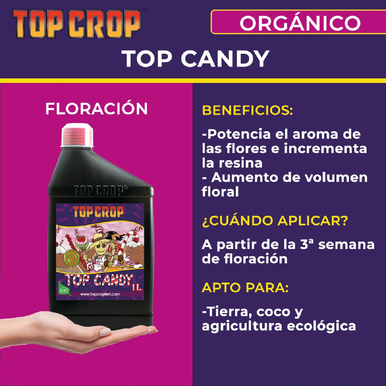 Su principal función es el aumento de peso y volumen de las flores. Mejora notablemente el olor y el sabor de las cosechas.